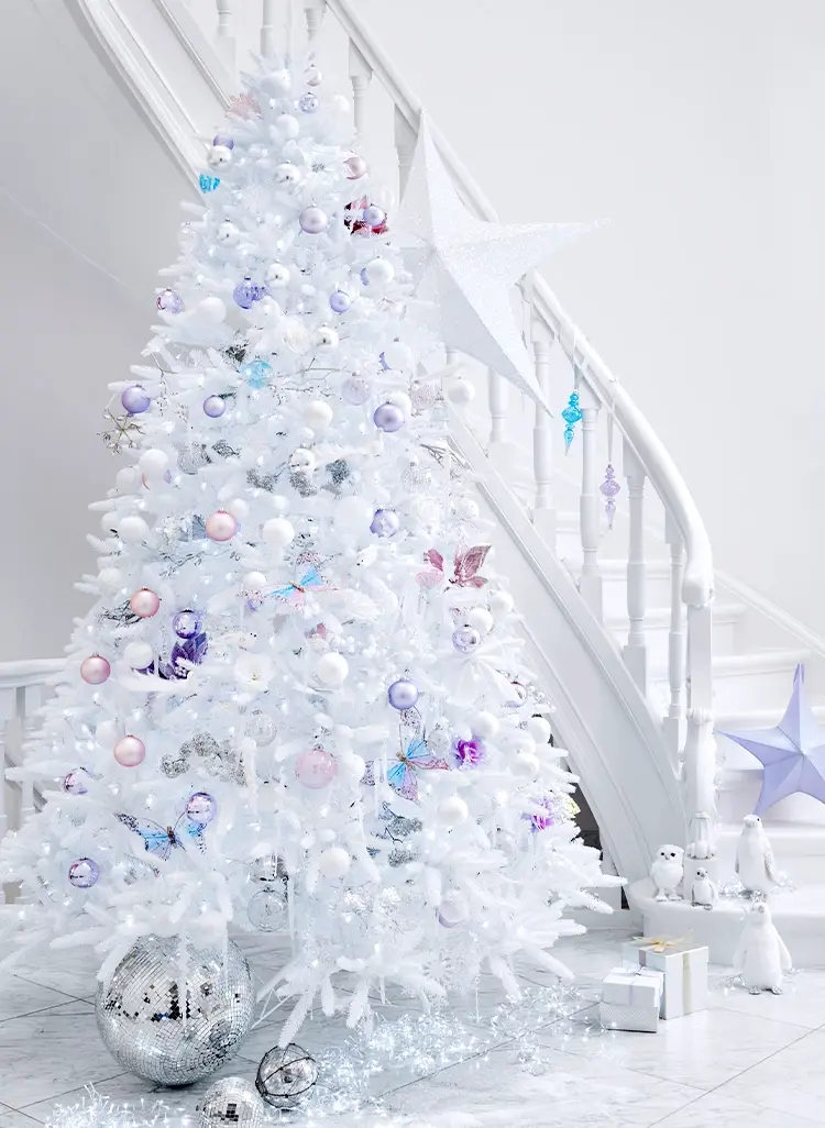 In a faraway land of eternal winter, an enchanted ice castle stands, dazzling in beauty with skies that shift from blue to pink and lilac. At its entrance is a magical Christmas tree with iridescent branches, sparkling with icicles, Swarovski ornaments, and pearl chains. Inside, the Winter Queen, wearing a diamond crown, sits on her ice throne. With a snap of her fingers, magical white animals like snowy owls, a white hart, crowned penguins, and snow rabbits appear by her side.