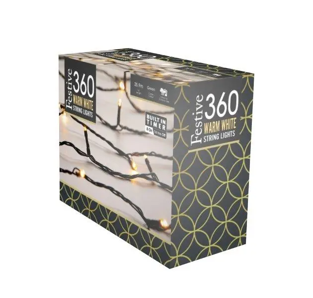360 light string with 8 multifunction actions - 360 warm white led bulbs - lead length 8m - lit length 28.72m - bulb spacing 80mm - bulb rating 3v/0.008a/0.024w - transformer rating ip20/32v/3.6va - with timer - indoor / outdoor - green cableSorry, this product is currently out of stock. Please enter your email address, and we'll send you a notification as soon as it's available again,