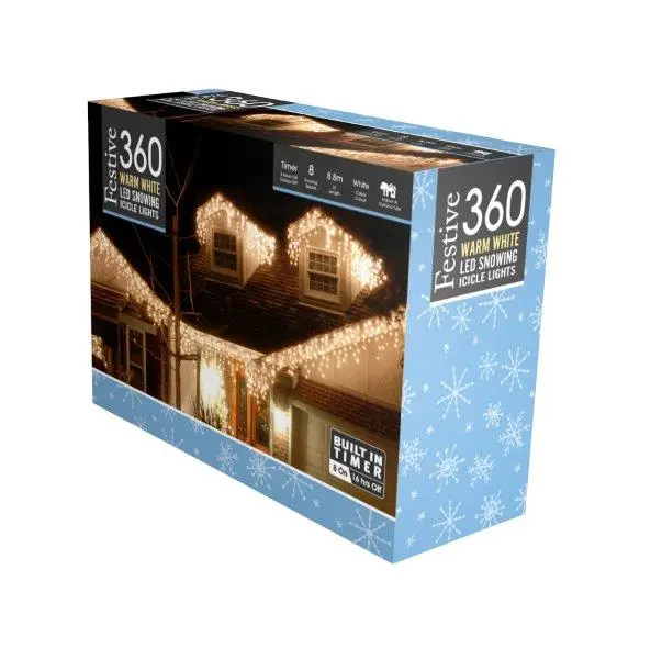 Create a cozy winter atmosphere with the 360 Snowing Icicle Lights in warm white. This set features a mesmerizing snowfall effect, adding a warm and inviting touch to your holiday decor. With a versatile 4-way design, these lights can be hung in various configurations, providing a stunning visual impact for the holiday season.