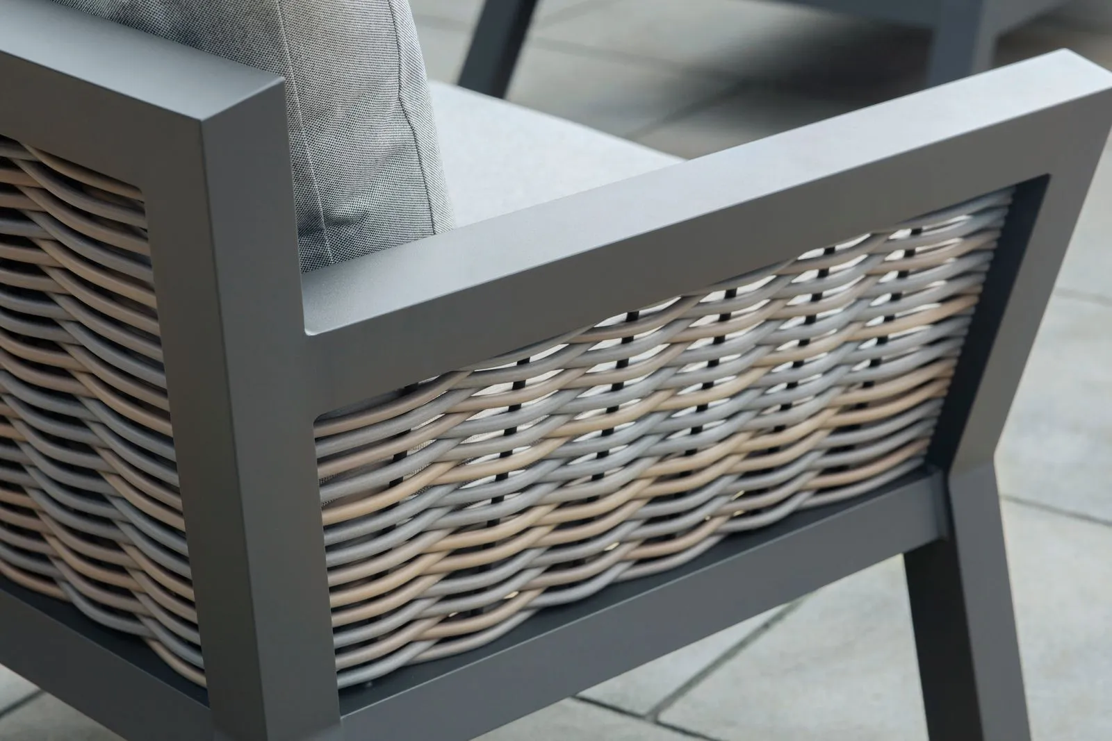 Style Notes: Tuscan combines aluminium and rattan for the perfect hybrid of classic and contemporary. Featuring coffee table, and a bold square profile, softened by muted tones of mushroom and grey.