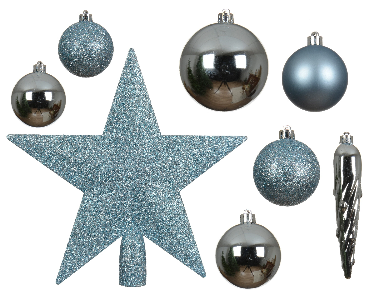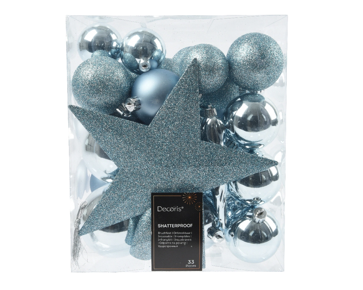 Decoris 8cm Shatterproof Baubles & Star Blue Ice - Pack of 33