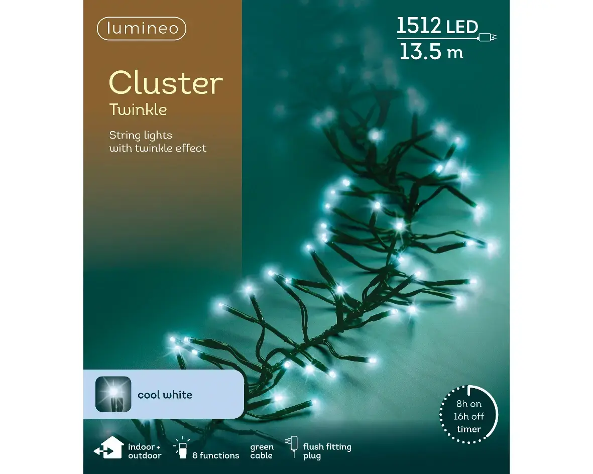 Brighten up your festive displays with the Lumineo 1512 Cluster Lights. Featuring 1512 cool white LEDs on a green wire, these cluster lights deliver a crisp, modern glow, perfect for medium-sized trees, garlands, and outdoor decorations. The green wire blends seamlessly with natural foliage, making these lights ideal for both indoor and outdoor use.