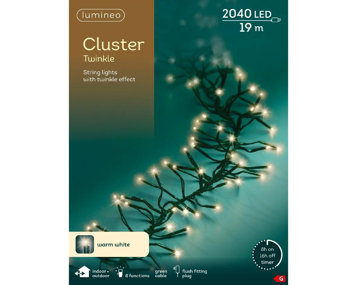 Create a stunning and full-bodied lighting display with Lumineo 2040 Cluster Lights. Featuring 2040 warm white LEDs closely packed on a green wire, these lights provide a dense, radiant glow that’s perfect for larger trees, garlands, and outdoor installations. The green wire blends seamlessly with greenery, making them ideal for both indoor and outdoor use.