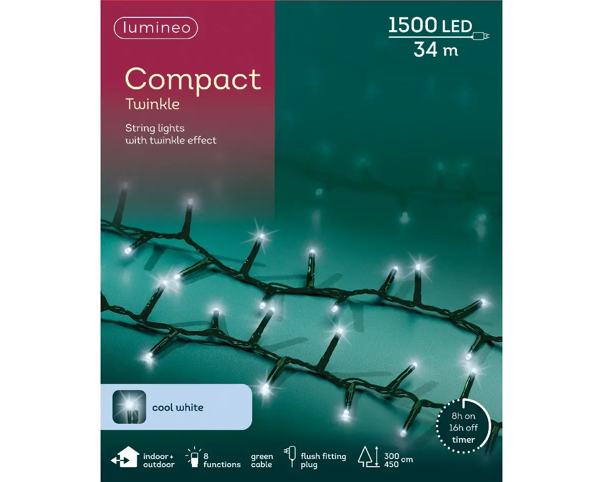 Brighten your festive displays with the stunning Lumineo 1500 Compact Lights. Featuring 1500 cool white LEDs on a green wire, these lights create a bright, crisp glow that’s perfect for illuminating large trees, garlands, and outdoor decorations. The green wire blends naturally with foliage, making these lights ideal for both indoor and outdoor use.