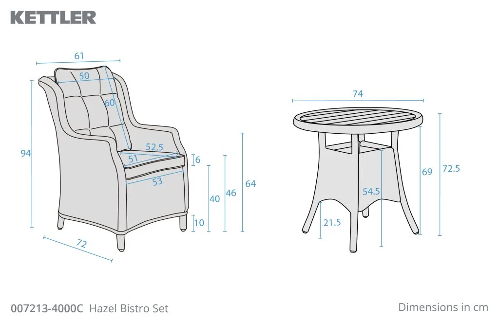 You can buy the Kettler Hazel 2 Seat Bistro Set online in our webshop or visit our in Wolverhampton, near Walsall, Birmingham, Dudley and Stafford, to buy the Kettler Hazel 2 Seat Bistro Set or other Bistro Sets products. Our garden centre is conveniently located, has free parking and is easy to visit from places like Walsall, Birmingham, Dudley and Stafford. Feel free to visit us to buy Bistro Sets products.