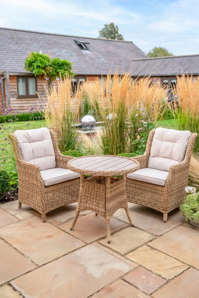 The set features a stylish 70cm table paired with two wicker chairs, each crafted with premium 6mm twisted wicker for a handwoven, natural look. The RainSafe cushions offer lasting comfort, while the lightweight design makes it easy to move and position wherever you please.