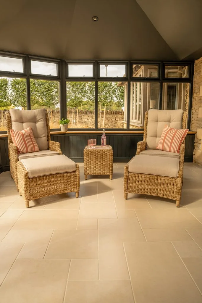 - Includes footstools and side table for drinks and snacks