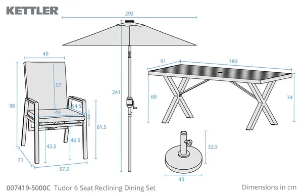Completing the set is a 3 metre wind up parasol in slate, perfectly coordinated with the dining chairs, along with a 15kg concrete base for reliable stability. Providing ample shade on sunny days, this all-in-one dining solution is built for low-maintenance outdoor living and can be left outdoors all year round. As part of the wider Tudor range, it also pairs seamlessly with matching seating and accessories to create a cohesive garden setting.