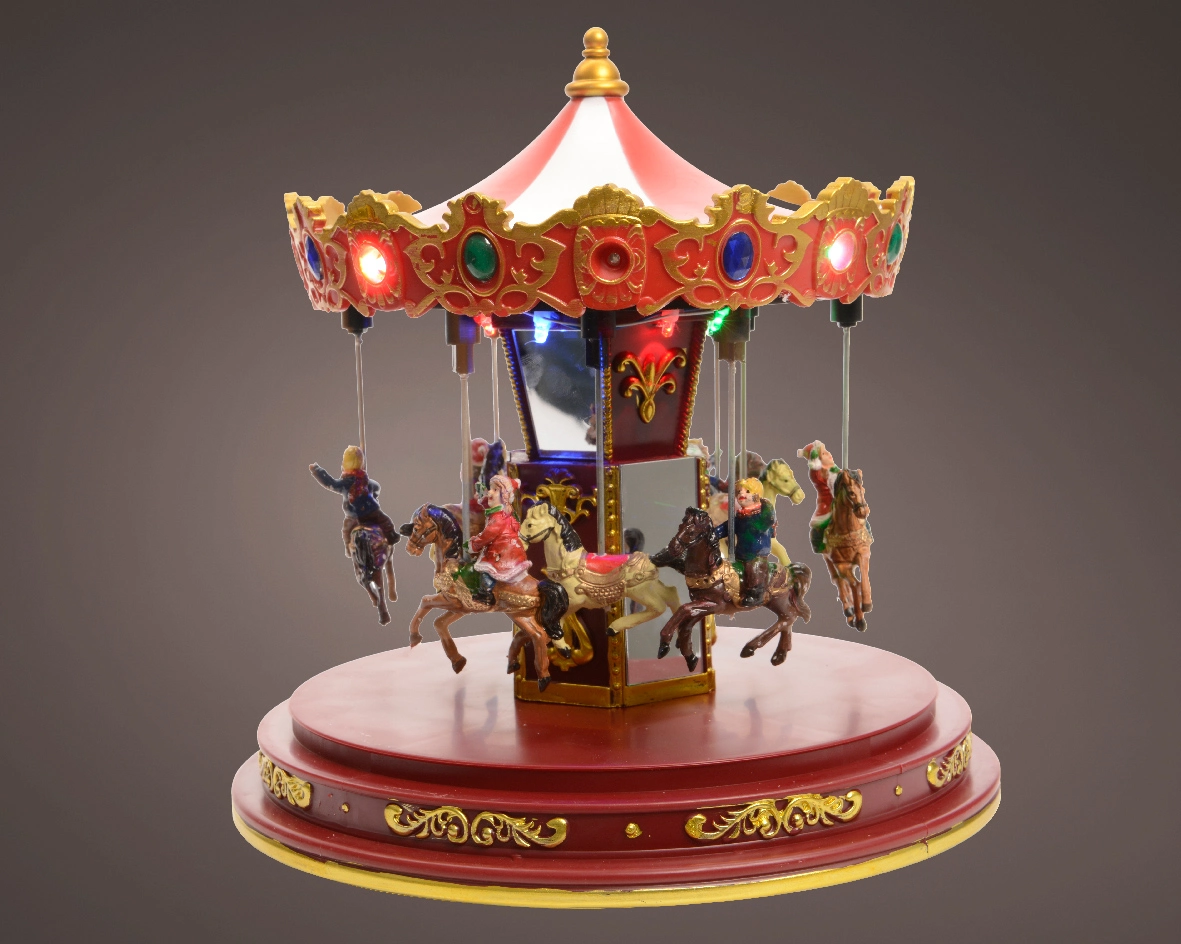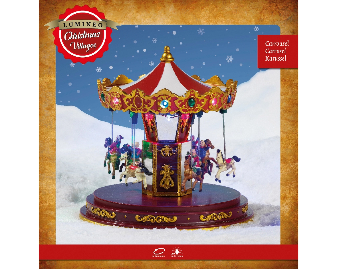 - Intricate village design with beautifully detailed carousel horses and Christmas decorations